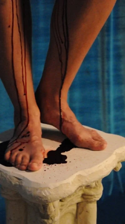 The exhibition’s title, Frozen in the Permanent Memorial, is a reference to Freud's flawed yet poetically described theory of fetish development. Here it relates to a particular phenomenon in Catholic culture in which ritualized reverence is transferred to the materials of worship—purple velvet, polished marble, the smell of warm wax— to the point that the mere presence of these signifiers invoke a visceral reaction. Exclusion or misinterpretation of the lived experience of women in Freud’s writings and Catholic doctrine are rampant, and both fetishize body parts to the point of dismemberment. A kindred artistic sensibility is found in Jean Genet’s novel Our Lady of the Flowers in which communion—receiving the body of another into one’s own—is simultaneously described in the holiest and raunchiest of contexts. This subtext, an unending oscillation between the abject and the exalted, drives both the sculptural and video works in the exhibition.